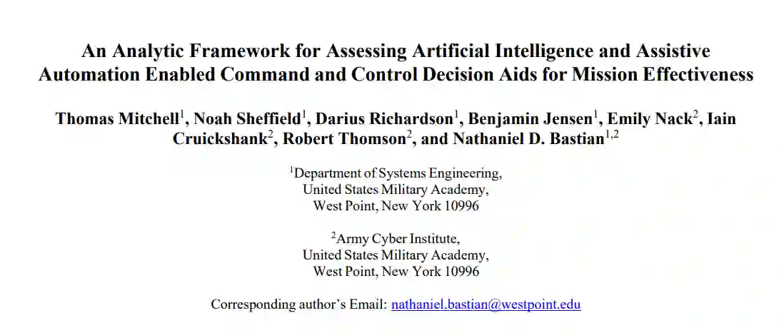 美国陆军目前正在开发将人工智能和辅助自动化(AI/AA)技术融入作战空间的决策辅助系统。据美国陆军机动中心称,在决策辅助系统等人工智能/辅助自动化系统的协助下,士兵的作战效率可提高10倍(Aliotta,2022年)。决策辅助工具旨在协助指挥官在作战场景中减少决策时间,同时提高决策质量和任务效率(Shaneman, George, & Busart, 2022);这些工具有助于整理作战数据流,协助指挥官进行战场感知,帮助他们做出明智的实时决策。与使用AI/AA决策辅助工具相关的一个问题是,陆军目前缺乏一个有效的框架来评估工具在作战环境中的使用情况。因此,在本文中,我们将介绍我们对分析框架的研究、设计和开发,并结合建模和仿真来评估AI/AA决策辅助工具在指挥和控制任务中的有效性。