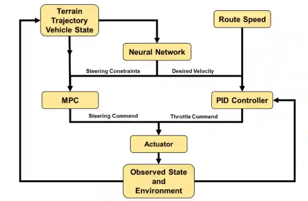 图3. 拟议的混合自主控制方法的结构:使用神经网络预测给定地形类型、车辆方向、地形和表面条件的临界值,并设置为自适应MPC或PID控制器的目标。