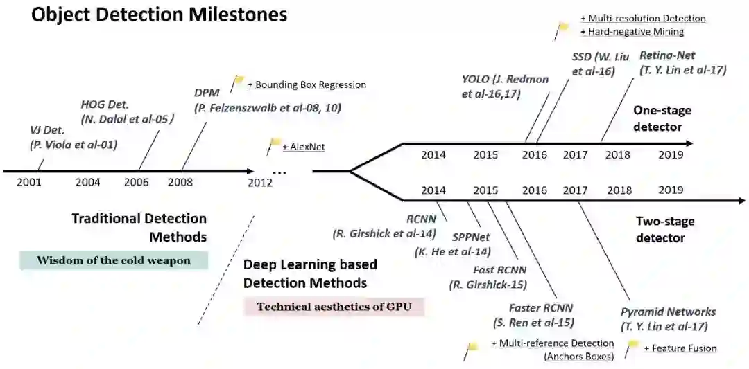 摘要:目标检测作为计算机视觉中最基本、最具挑战性的问题之一,近年来受到了广泛的关注。它在过去二十年的发展可以说是计算机视觉历史的缩影。如果我们把今天的目标检测看作是深度学习力量下的一种技术美学,那么让时光倒流20年,我们将见证冷兵器时代的智慧。本文从目标检测技术发展的角度,对近四分之一世纪(20世纪90年代至2019年)的400余篇论文进行了广泛的回顾。本文涵盖了许多主题,包括历史上的里程碑检测器、检测数据集、度量、检测系统的基本构建模块、加速技术以及最新的检测方法。本文还综述了行人检测、人脸检测、文本检测等重要的检测应用,并对其面临的挑战以及近年来的技术进步进行了深入分析。