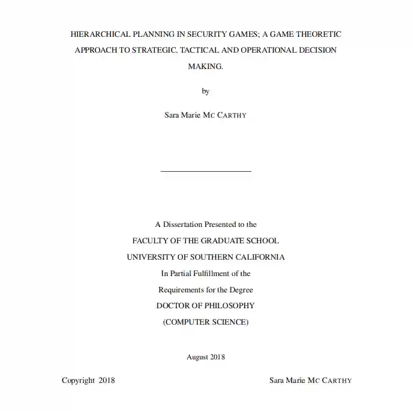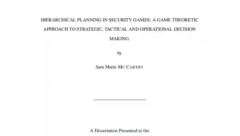 为了解决这些局限性,在这篇论文中,我为安全博弈的规划问题引入了一个新的层次结构,将问题分为三个层次的规划(i)战略规划,考虑长期的规划期限,以及与游戏设计有关的决策,这些决策限制了可能的防御者策略;(ii)战术规划,考虑较短的期限,处理资源的部署,以及在战略层面的限制下选择防御者策略;(iii)行动规划,处理在现实世界中的策略实施。