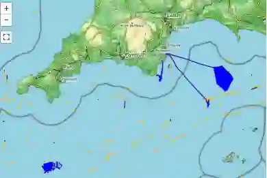 图:使用基于 OPIS 本体的知识图从 AIS 数据(显示为橙色)推断出拖网事件(显示为蓝色)。这些事件是使用逻辑推理来识别的,给定一组描述拖网行为(即模式)的特征,这些特征使用通用事件逻辑表示。