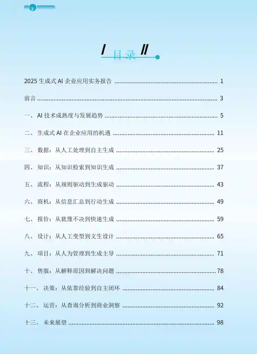 生成式AI技术正以惊人的速度演进,重塑着全球商业竞争格局。在这一变革浪潮中,企业应用生成式AI的紧迫性前所未有率先实现技术落地的组织将获得显著的竞争优势。 本报告旨在为企业提供系统性的生成式AI应用指南,助力决策者把握这一技术革命带来的战略机遇。当然,在积极拥抱机遇的同时,我们也必须正视生成式AI在输出结果绝对准确性上(如“幻觉”现象)的固有挑战。然而,这不应成为企业探索创新的绊脚石。通过区分并针对性管理生成式AI在“对不对”(准确性)和“好不好”(质量效益)两个层面的应用表现,企业能有效驾驭这一变革性技术,化挑战为机遇,充分释放其潜能。 生成式AI正从两个维度重构企业生产力:一方面通过“创新·生产力”实现效率提升,显著降低运营成本;另一方面通过“创·新生产力”催生范式突破,创造全新的生产力和商业价值。这种双重变革力量正在重塑从产品服务到商业模式的各个层面。基于对技术趋势的深入观察,本报告构建了以多模态大模型为核心的企业应用架构,通过“数据-知识-决策-应用-数据”的闭环系统,全面赋能企业运营管理。 报告首先剖析了AI技术成熟度与发展趋势,介绍了生成式AI应用的发展现状,特别关注AIAgent的演进对企业工作流的深刻影响。 随后,报告聚焦数据、知识、流程、商机、报价、设计、项目、售服、决策、运营等十大核心模块,采用“痛点分析-解决方案-案例研究-价值定位”的框架,为企业提供切实可行的落地路径参考。 值得关注的是,技术的突破需要匹配管理模式的革新。我们提出GIGA协同模式,包含共志(Co-Goal)、共智(Co-Intelligence)、共治(Co-Governance)和共致(CoAchievement)四个关键维度,为企业构建人机协同的新型组织范式提供系统指导。这一模式强调,企业需要超越工具思维,在战略愿景、智能协作、治理机制和价值创造等层面实现全面转型。 随着生成式AI技术的持续突破和应用模式的不断成熟,一个更智能、更高效、更具创造力的商业新时代正在到来。要在这一变革浪潮中占据领先地位,企业必须积极推进数智化转型,即在数字化基础上,通过数据与智能的深度融合,实现运营模式和业务能力的全面升级与革新。这一转型的核心引擎,正是“数智驱动”,它代表了企业数智化运营的最高形态,其关键特征在于“数据自决”(在日常业务运行中,系统自主处理数据并决策,自动推进任务执行)与“智能生成”(在更复杂的业务场景中,利用AI自主创造解决方案和内容,实现决策规划和执行的自动化与智能化)。能够培养并内化这种“数智驱动思维”的企业,将进化为真正的AI原生组织,它们不仅将生成式AI视为效率工具,更将其作为重塑商业模式的核心引擎,从而赢得决定性的竞争优势。本报告期望通过系统的分析框架和丰富的实践案例,帮助企业跨越从技术认知到商业价值的鸿沟,在生成式AI赋能的道路上实现可持续的创新引领,在这场转型中赢得先机。