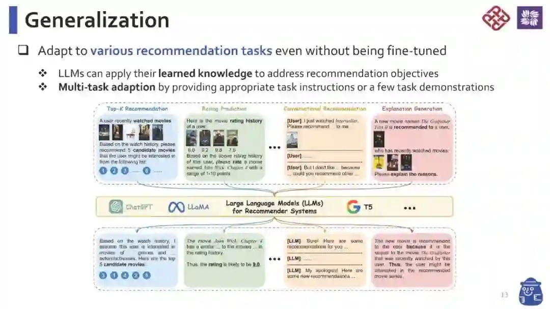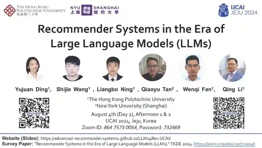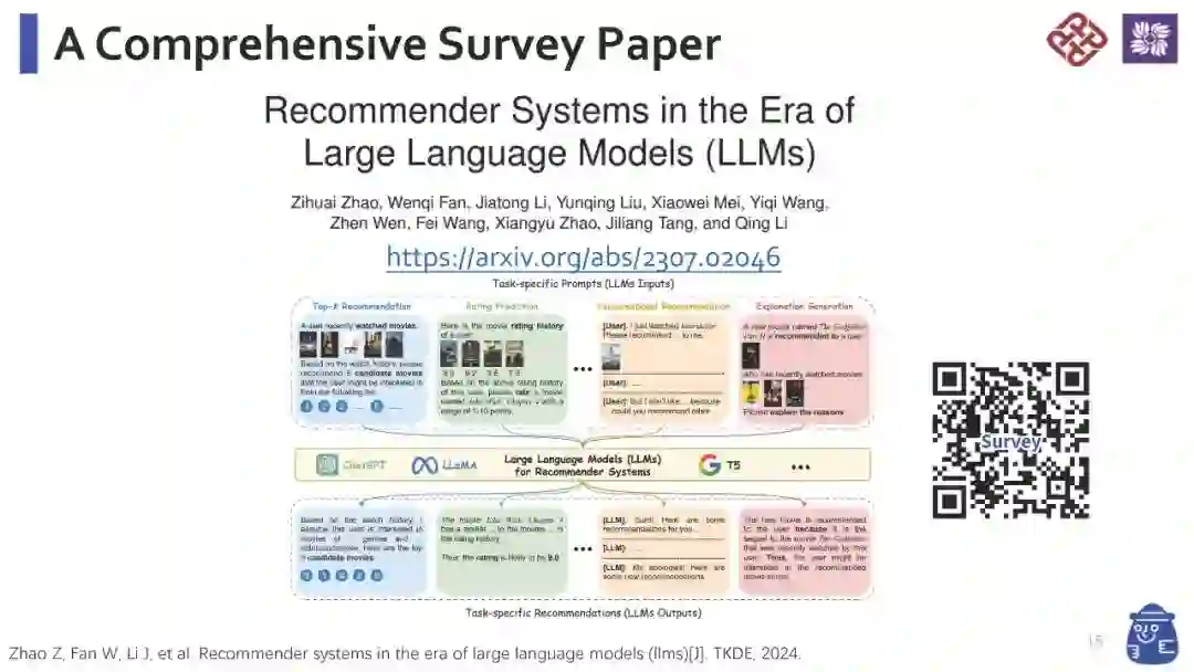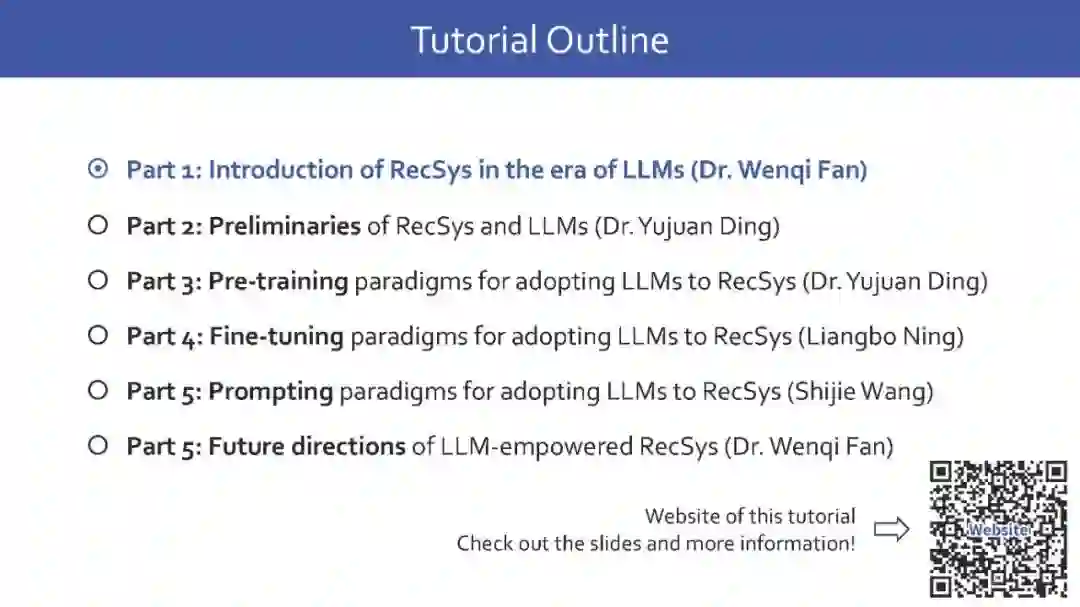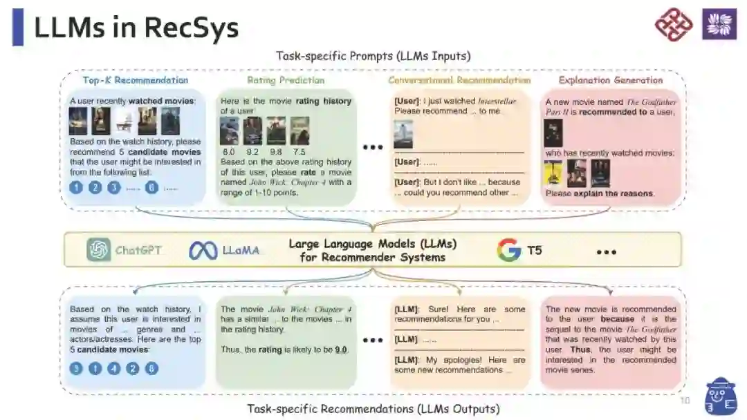 鉴于信息量的爆炸性增长,推荐系统已成为在线活动中不可或缺的服务之一,能够有效地帮助用户找到他们感兴趣的内容或目标购买的产品,从而提升用户参与度和满意度。尽管在过去的几年中,得益于深度学习的进步,推荐方法得到了极大的发展,但它们仍然面临着几个限制。现有的方法可能难以有效理解和捕捉文本的旁信息,难以泛化到各种推荐场景,并在其预测中进行推理。最近,大语言模型(LLMs)的出现彻底改变了自然语言处理(NLP)领域,因为它们具有卓越的语言理解和生成能力。更令人印象深刻的是,它们能够通过推理来解决复杂问题,并且可以轻松泛化到新的领域或任务。这样的能力为解决现有推荐方法中的上述限制提供了机会,这使得基于LLM的推荐系统成为未来一个有前景的研究领域。为此,在本教程中,我们旨在从预训练、微调和提示等各个方面提供关于基于LLM的推荐系统的最新进展的全面概述。这预计将帮助AI社区中相关领域的研究人员和工业实践者获得对基于LLM的推荐系统的总体理解,并为他们提供新的想法以进行更多令人兴奋的研究。 我们的综述论文:《大语言模型(LLMs)时代的推荐系统》 我们的幻灯片:第一部分,第二部分 教程网站:https://advanced-recommender-systems.github.io/LLMs4Rec-IJCAI/ 本教程的主题包括但不限于以下内容: