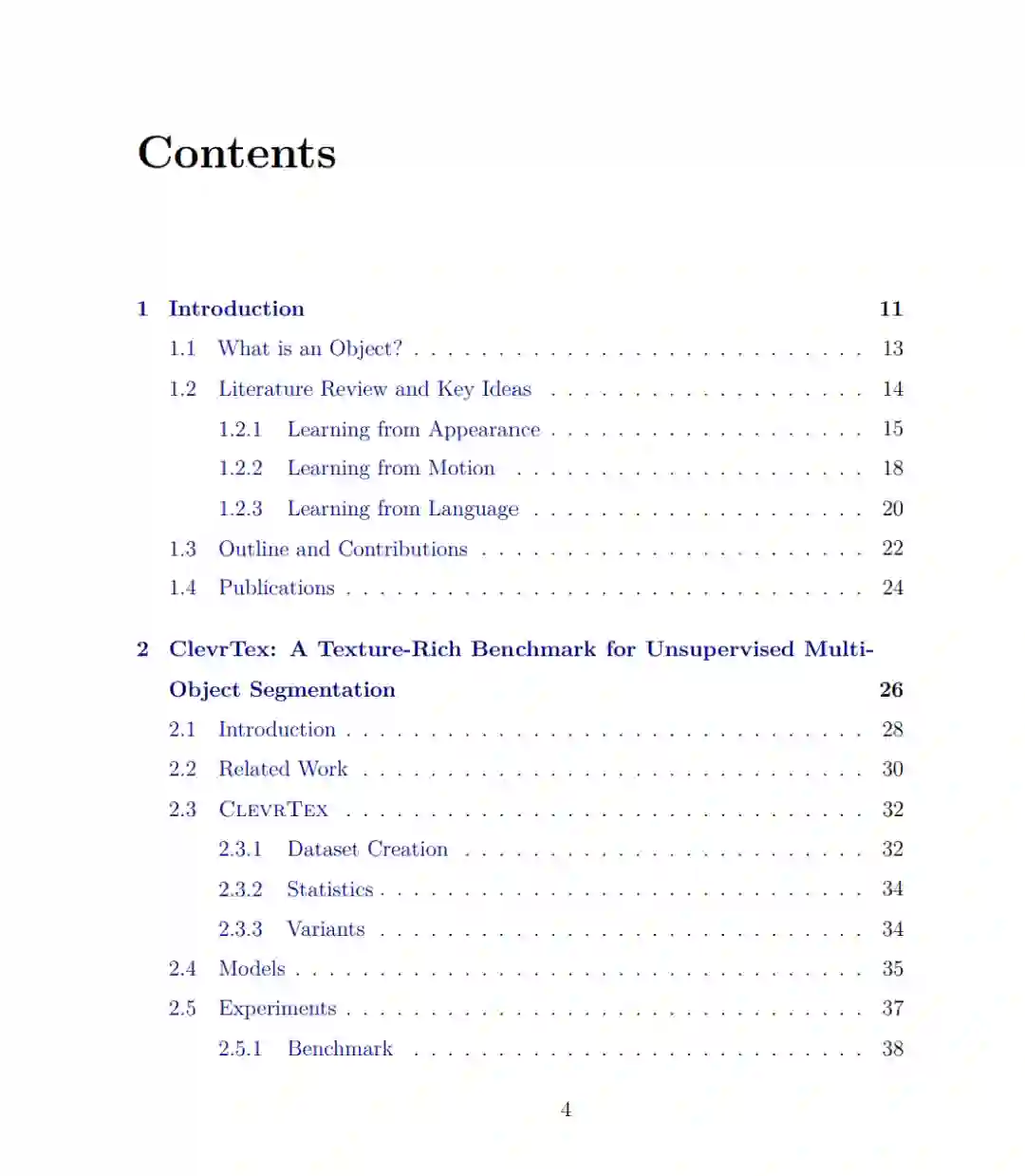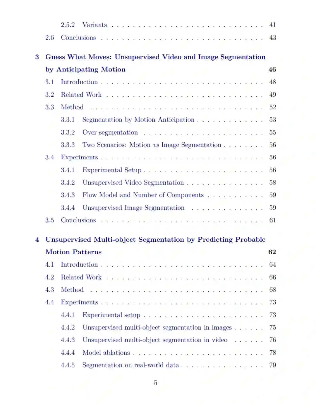 视觉世界由离散的、有意义的物体组成,人类能够在没有监督的情况下轻松地感知并分割这些物体。在计算机视觉中模拟这一能力是一个根本性的问题,为监督方法提供了一种更具认知合理性和可扩展性的替代方案。本文探讨了不依赖于密集掩码标注的情况下,发现视觉物体的原则性方法。 首先,我们探讨了组合性原则(principle of compositionality),该原则认为场景是由离散的、可重用的物体组成的。基于这一原则,已有许多方法,但我们注意到它们仅适用于简单的环境。为此,我们引入了一系列新的基准数据集,分析现有方法是否能扩展到视觉上复杂的输入。大多数方法在处理复杂场景时表现不佳,需要更简单、统一的外观才能产生良好的分割效果。 其次,我们探讨了共同命运原则(principle of common fate),该原则认为一起运动的实体应当被归为一组。我们设计了几种损失函数,将掩码预测与场景运动的估计关联起来,以处理二物体和多物体的场景。我们提出的这些方法可以应用于各种现有的分割方法,借助运动学习来补充其学习原理。 随后,我们考虑了瞬时运动的局限性,并提出了使用稀疏点轨迹来整合长期运动信息。为实现这一目标,我们设计了一种损失函数,强化了这样一个理念:一个物体中的轨迹应具有较高的冗余性。 最后,我们探索了如何利用现有语言结构来进行物体分割,而无需任何密集的掩码标注。我们构建了一种开放词汇分割方法,使用预训练的文本到图像扩散模型(text-to-image diffusion model)将语言与物体的视觉表示相连接。这种方法避免了进一步训练,展示了文本到图像扩散模型作为强大的开放词汇分割方法的潜力。