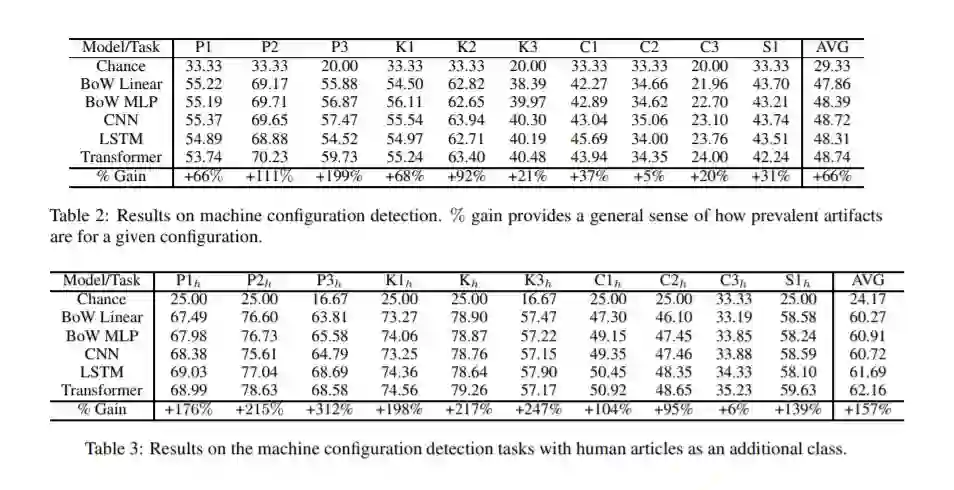 本文试图对神经文本生成模型的基本性质有更深入的理解。对机器生成文本中由于建模选择而出现的构件的研究是一个新兴的研究领域。在此之前,这些人工制品在生成文本中出现的范围和程度还没有得到很好的研究。为了更好地理解生成文本模型及其构件,我们提出了一项新的任务,即区分给定模型的几个变体中哪个生成了一段文本,我们进行了一系列诊断测试,以观察建模选择(例如,抽样方法、top-k概率、模型架构等)是否在它们生成的文本中留下可检测的构件。我们的关键发现得到了一组严格实验的支持,即存在这样的构件,并且可以通过单独观察生成的文本推断出不同的建模选择。这表明,神经文本生成器对各种建模选择的敏感度可能比之前认为的要高。