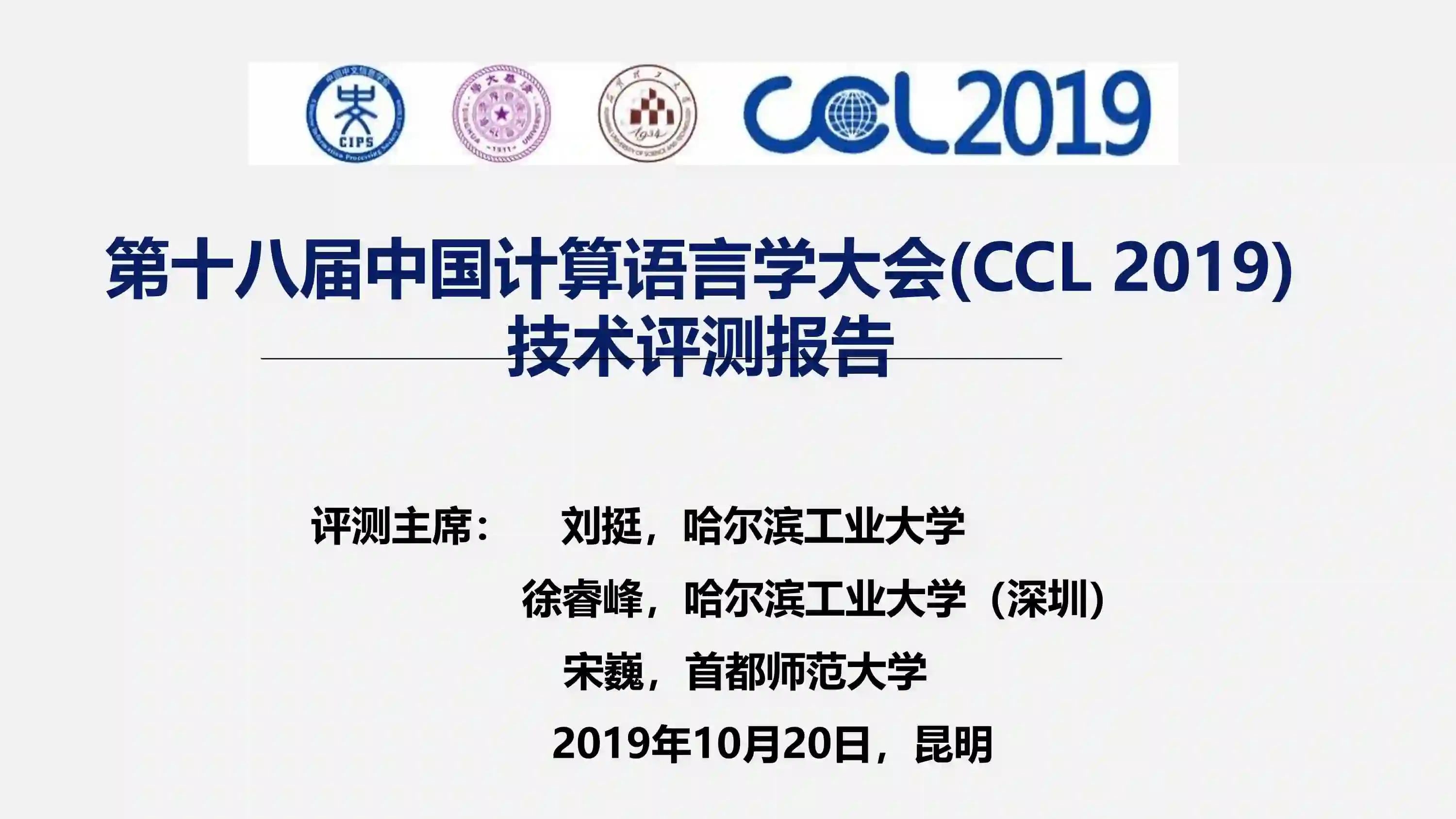 “第十八届中国计算语言学大会” (The Eighteenth China National Conference on Computational Linguistics, CCL 2019)技术评测共包括 三个评测任务:第三届“讯飞杯”中文机器阅读理解评测(CMRC 2019)、CCL “小牛杯”幽默计算评测、CCL“中国法研杯”相似案例匹配评测竞赛。从2019年4月开始,经过为期10个月的比赛,于2019年10月圆满结束。