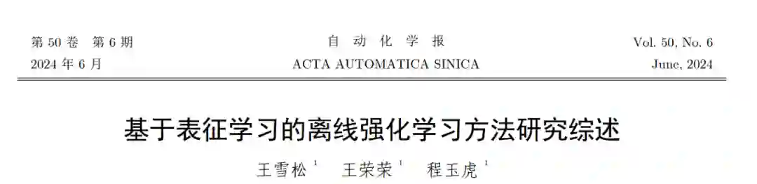 强化学习 (Reinforcement learning, RL) 通过智能体与环境在线交互来学习最优策略, 近年来已成为解决复杂环 境下感知决策问题的重要手段. 然而, 在线收集数据的方式可能会引发安全、时间或成本等问题, 极大限制了强化学习在实 际中的应用. 与此同时, 原始数据的维度高且结构复杂, 解决复杂高维数据输入问题也是强化学习面临的一大挑战. 幸运的 是, 基于表征学习的离线强化学习能够仅从历史经验数据中学习策略, 而无需与环境产生交互. 它利用表征学习技术将离线 数据集中的特征表示为低维向量, 然后利用这些向量来训练离线强化学习模型. 这种数据驱动的方式为实现通用人工智能 提供了新契机. 为此, 对近期基于表征学习的离线强化学习方法进行全面综述. 首先给出离线强化学习的形式化描述, 然后 从方法、基准数据集、离线策略评估与超参数选择 3 个层面对现有技术进行归纳整理, 进一步介绍离线强化学习在工业、推 荐系统、智能驾驶等领域中的研究动态. 最后, 对全文进行总结, 并探讨基于表征学习的离线强化学习未来所面临的关键挑 战与发展趋势, 以期为后续的研究提供有益参考.