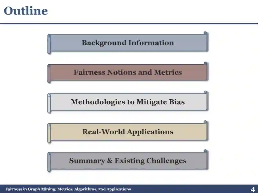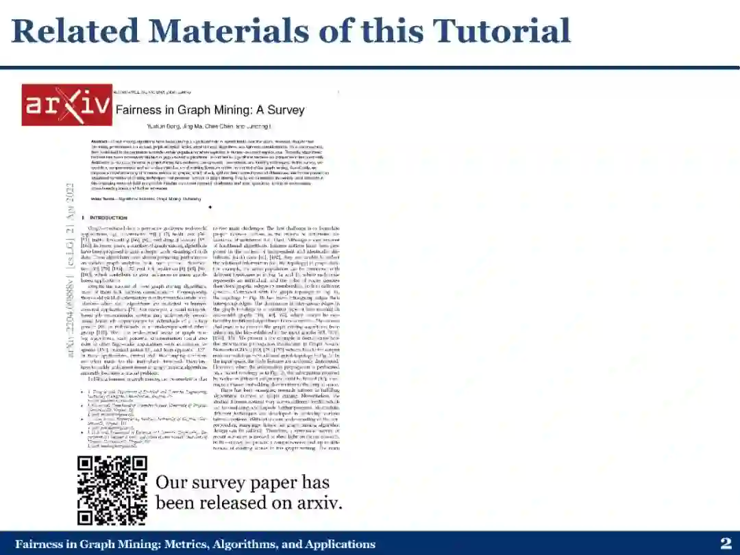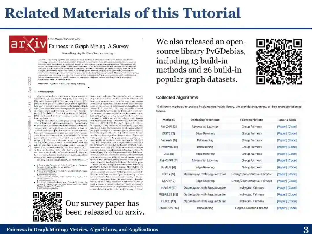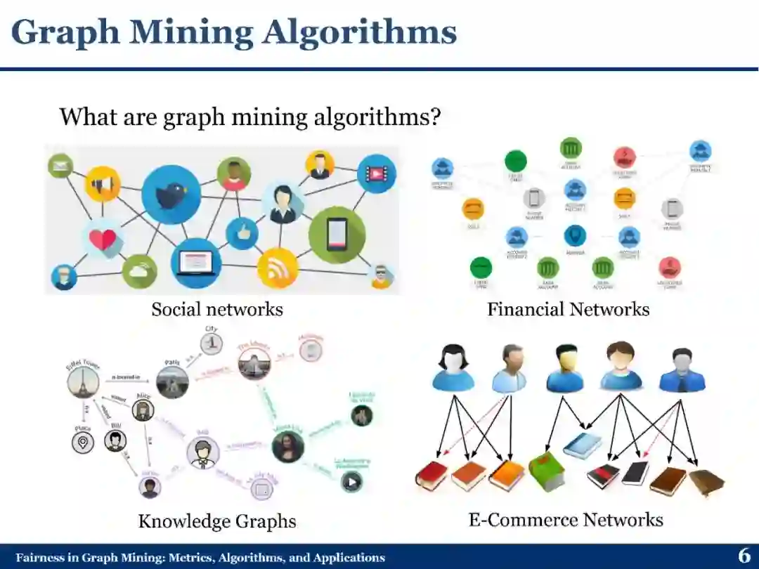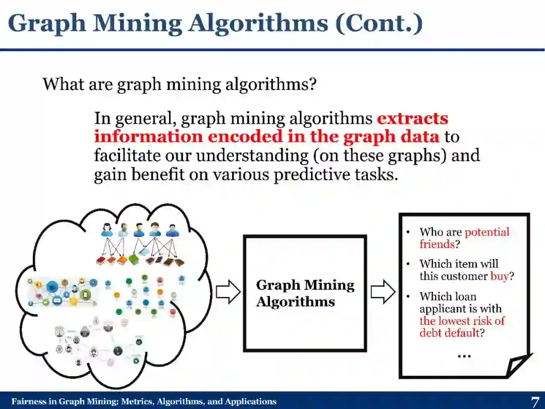 图数据在现实世界的各种应用中无处不在。为了更深入地理解这些图,图挖掘算法多年来发挥了重要作用。然而,大多数图挖掘算法缺乏对公平性的考虑。因此,它们可能对某些人口次群体或个人产生歧视性的结果。这种潜在的歧视导致社会越来越关注如何缓解图挖掘算法中表现出的偏见。本教程全面概述了在测量和减轻图挖掘算法中出现的偏差方面的最新研究进展。首先介绍了几个广泛使用的公平性概念和相应的指标。然后,对现有的去偏置图挖掘算法技术进行了有组织的总结。展示了不同的现实世界应用在去偏后如何受益于这些图挖掘算法。对当前的研究挑战和开放问题提出了见解,以鼓励进一步取得进展。