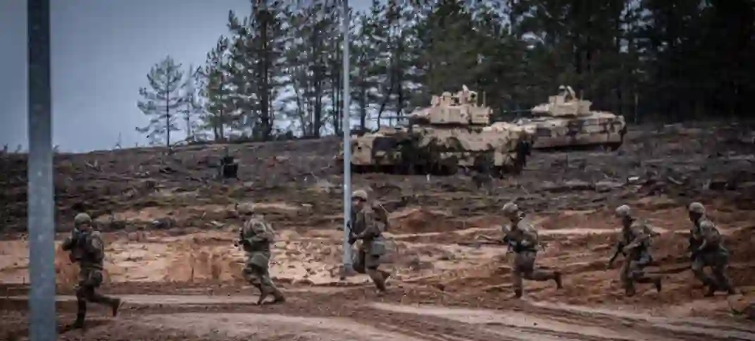 图:2020 年 2 月 12 日,立陶宛帕布拉代(Pabradė)训练场,美国陆军第一骑兵师的士兵在实弹演习中穿越线性危险区域。