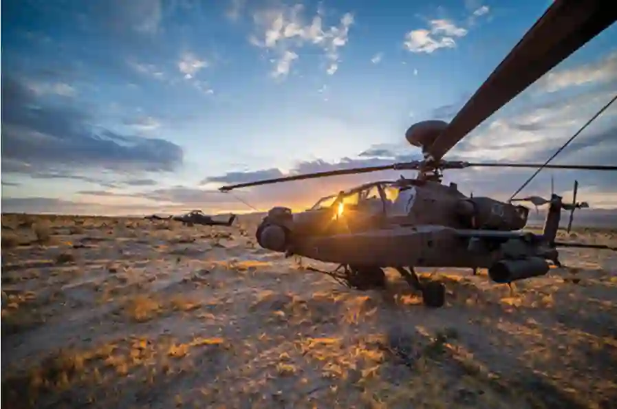 图:美陆军航空系统,如这些来自北卡罗莱纳州陆军国民警卫队第 130 航空团第 1 营的 AH-64 阿帕奇直升机,部署在加利福尼亚州欧文堡国家训练中心的莫哈韦沙漠,需要在反进入和区域封锁的有争议空域内与拥有限制机动自由的先进能力的对手作战。