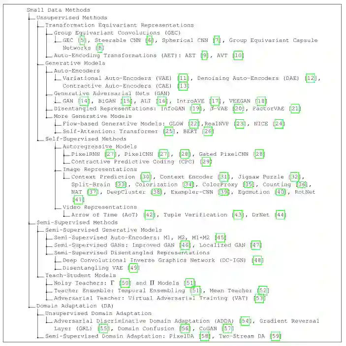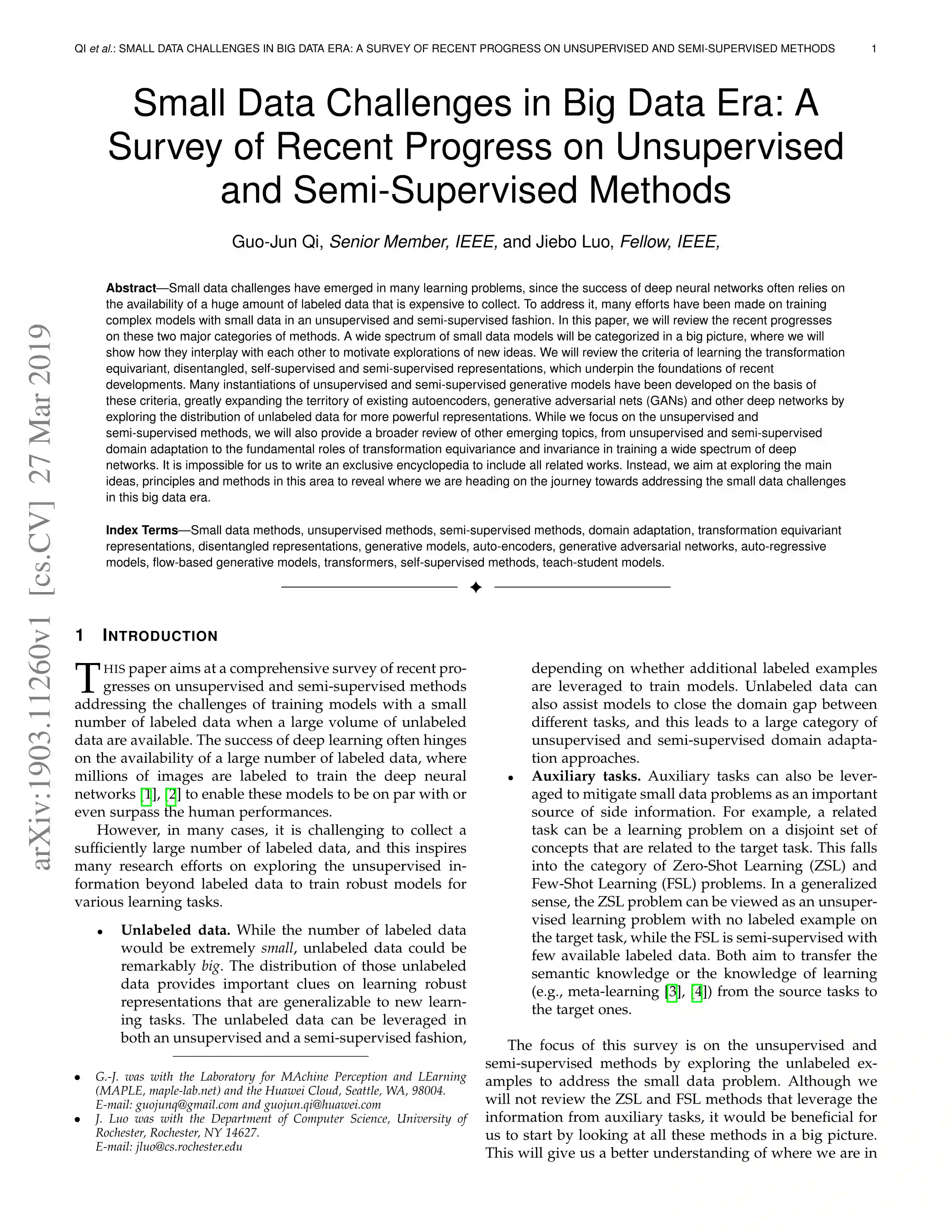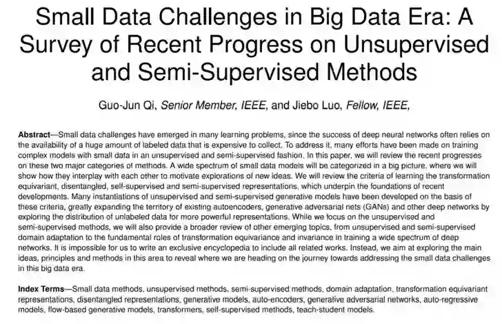 基于神经网络的深度学习方法往往需要大量标注样本,而在很多领域往往是缺乏充足样本数据的,比如在医疗领域,高质量的医疗影像大数据样本很难获取,且人工标注成本较高。因此,亟待研究基于小样本数据集或弱标签标注的机器学习方法。最近,齐国君和罗杰波两位知名学者在ArXiv发布了关于小样本数据集的无监督与半监督学习综述论文,12页103篇参考文献,详细阐述了最新进展。