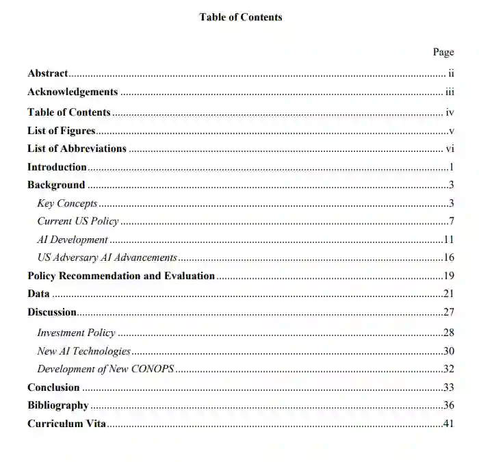 大国竞争必须相对于其他大国的能力进行评估。因此,没有一种能力可以被评估为产生可持续的绝对优势。然而,在潜在的对手获得同样的能力之前,开发人工智能技术和应用为21世纪冲突设计的CONOPS的能力将在整个政治/军事领域产生一个暂时的战略优势。美国目前的公共政策和战略并没有延伸到25年后。随着中国准备在2030年成为占主导地位的人工智能大国,美国为了确保长期战略利益,不能接受人工智能竞赛的现状。由于人工智能领域的技术发展速度很快,人工智能RMA的状态和抓住初始优势的能力正在接近一个拐点。建议美国采取侧重于美国在人工智能竞赛中的首要地位的政策,特别是在致命性自主武器系统的研究和开发方面。美国在这一领域保持优势的能力对于国家安全和参与21世纪人工智能辅助和/或人工智能环境的准备工作是至关重要的。
