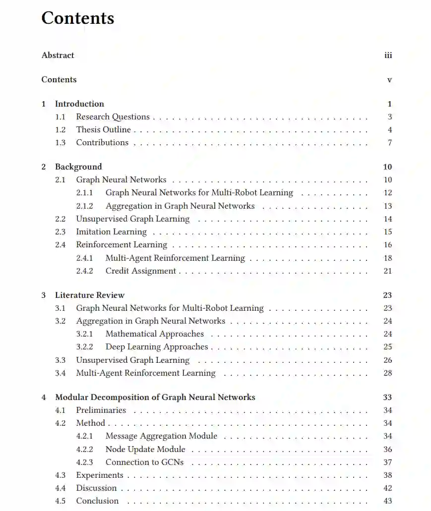 本论文探讨了GNNs在多智能体学习中的应用。为了指导我们的研究,我们提出以下研究问题: * 当前GNN架构在多机器人应用中的弱点是什么,如何改进?在为该领域提供贡献之前,重要的是要更好地理解GNNs的工作原理。当两个GNNs在性能上表现出差异时,我们能解释原因吗?或者更简单地说,我们能描述架构本身的差异吗?此外,如果我们能识别出一个弱点,那么我们如何解决它?由于答案在不同领域之间可能不同,我们专注于一个特定应用:基于GNN的多机器人系统策略。