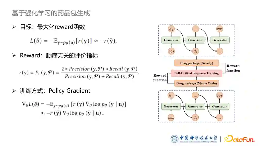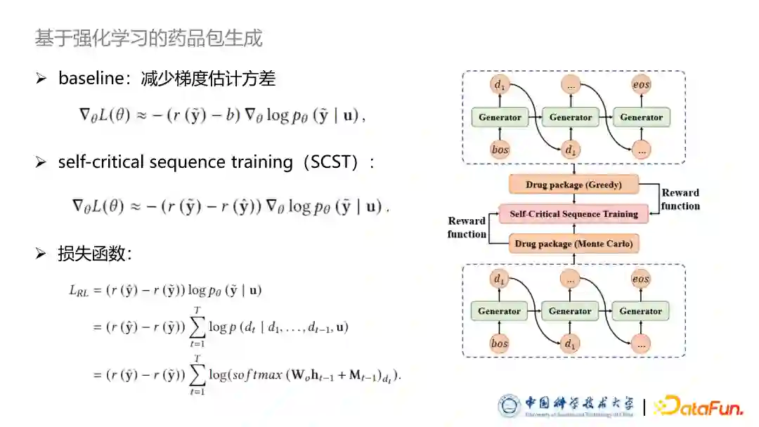 基于策略梯度的训练方法中,其重一个广为人知的方法是使用一个 baseline 减少梯度估计的方差,从而增加训练的稳定性。因此我们使用了基于 SCST 的训练方式,即 Self-critical sequence training 方法。baseline 同样来自于模型自身生成的这个药品包所获得的 reward,自己生成的方式我设计为 Greedy search 的正常序列生成方法。我们希望模型根据 Policy gradient 采样出来的药品包的 reward 要高于传统给予 Greedy search 生成出来药品包。基于此本文设计了强化学习的损失函数,如图中所示,这里就不详细的介绍推导过程。