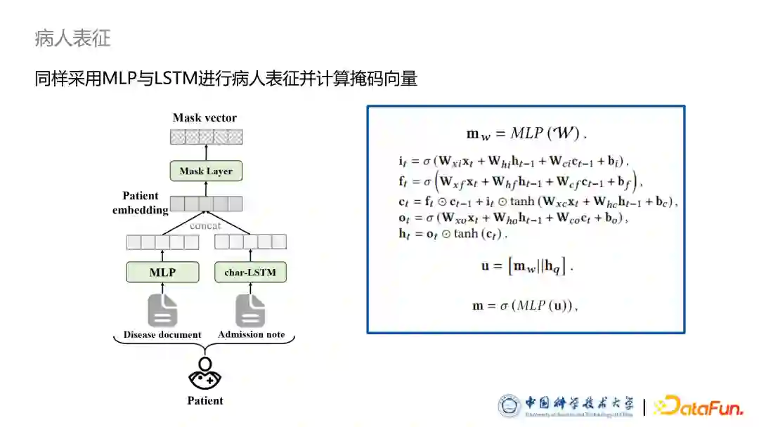 病人表征部分,同样采用了 MLP 和 LSTM 提取病人的表征向量,同时也会计算掩码向量,后续用于捕捉病人个性化表示向量。