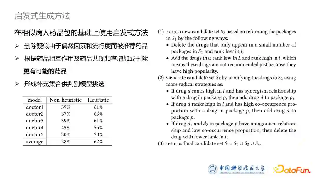 针对上文中提出的判别式模型的缺点,我们设计了一些启发式生成方法:通过在相似病人的药品包中进行增加和删除部分药品的操作,形成一些历史记录中从来没有出现过的药品包供模型挑选。实验结果证明这种简单的方法十分有效,为后续方法提供了基础。