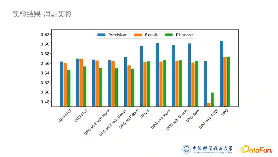 后续我们还进行了一系列的消融实验。我们分别去掉了相互作用图,包括相互作用的掩码向量以及强化学习的模块进行消融,结果证明我们的各个模块都是有效的。同时可以看到,把 SCST 模块去掉,模型效果下降非常多,因此也证明了强化学习确实比较难训练。如果不加 Baseline 限制,整个训练过程会非常抖动。