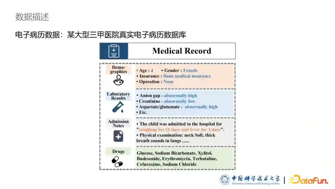 首先介绍工作中使用的数据描述。我们在研究工作中使用的电子病历是来自于一个大型三甲医院的真实电子病历数据库,其中每条电子病历都包括了以下几类信息:一是患者的基本信息,包括患者的年龄、性别、医保等等;二是患者的化验信息,包括医生关注的化验结果的异常,以及异常的种类:偏高、偏低、是否阳性等;三是医生为患者撰写的病情描述:包括患者为什么入院、以及初步体格检查等信息;最后是医生为患者开的一组药品。此电子病历数据是一个异构数据,包括年龄、性别、化验等结构化信息以及病情描述等非结构化文本信息。