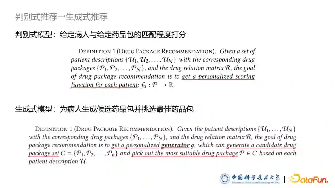 生成式药品包推荐以上判别式模型只能在已有药品包中进行挑选,没有生成新的药品包能力,会影响推荐效果,接下来我们将会介绍发表在 TOIS 期刊上的针对上一篇工作的扩展工作,目的是希望模型能够生成全新的为新病人量身定做药品包。此工作是保留了上一篇论文中图表示学习的核心思想,同时完全改变问题定义,把模型定义成生成模型,引入序列生成与强化学习技术,大幅的提高了推荐效果。