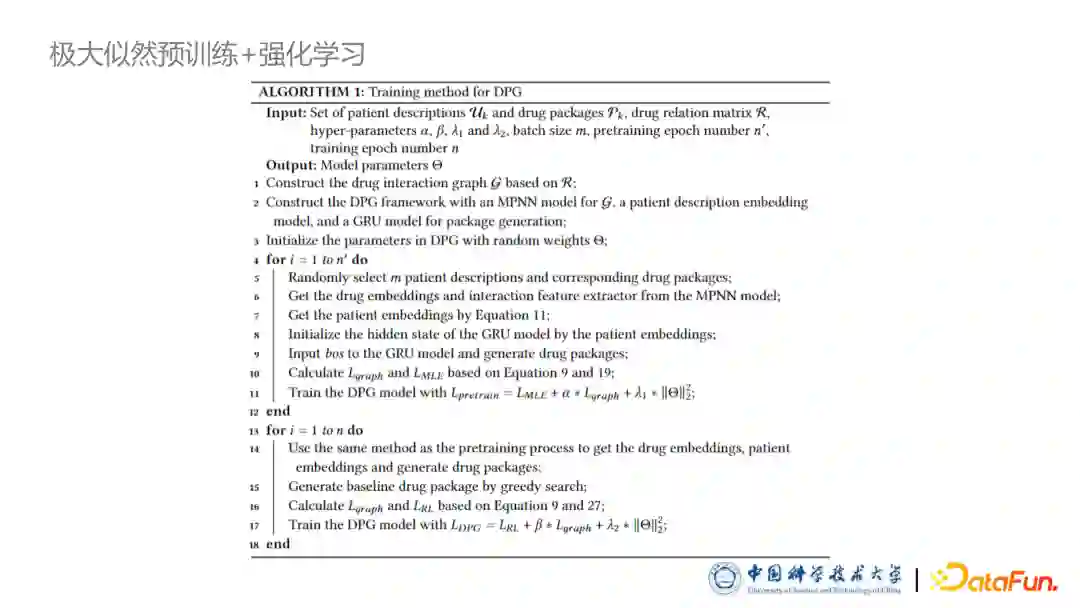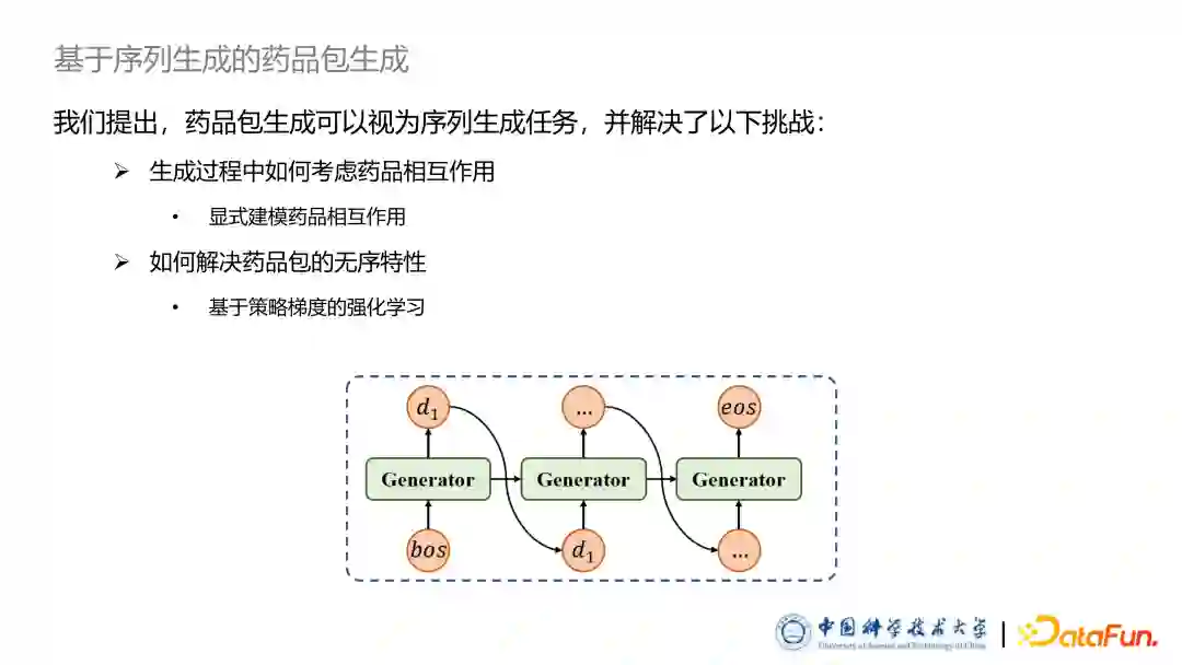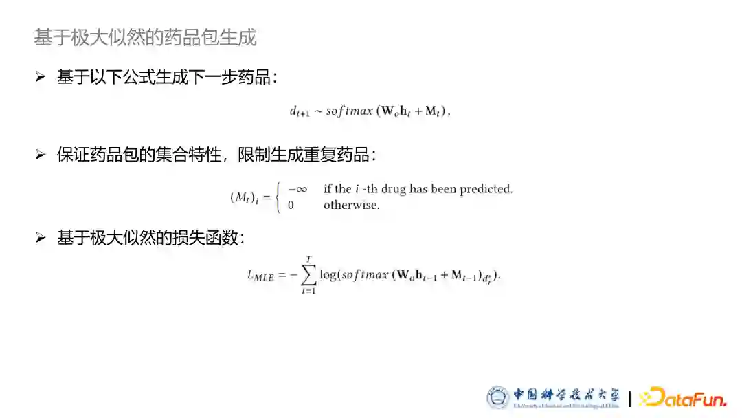 与经典的序列生成不同的是药品包其实是一个集合,不应该出现重复药品,因此我们后续增加了一个限制,让模型不能生成已经生成过的这个药品,保证生成结果一定是一个集合。最后我们采用了基于极大似然的 MLE 损失函数训练模型。