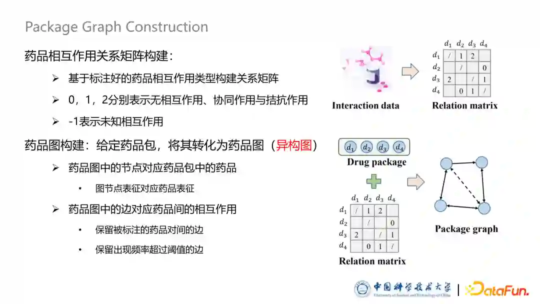 总结来说,结合以上的挑战,图表示学习技术是非常适合解决药品推荐系统中存在的问题。随着图神经网络的飞速发展,人们意识到图神经网络技术可以非常有效的建模节点之间的组合效应与节点之间的关系,这启发我们图表示学习技术或许将会成为构建药品推荐系统的一个利器。图中举例来说,我们可以将一个药品包根据其中的相互作用构建成图,通过已有的图神经网络进行建模。基于以上想法,我们使用图深度学习技术在药品推荐系统上做了两篇工作,分别发表在 WWW 和 TOIS 期刊上,以下是详细介绍。