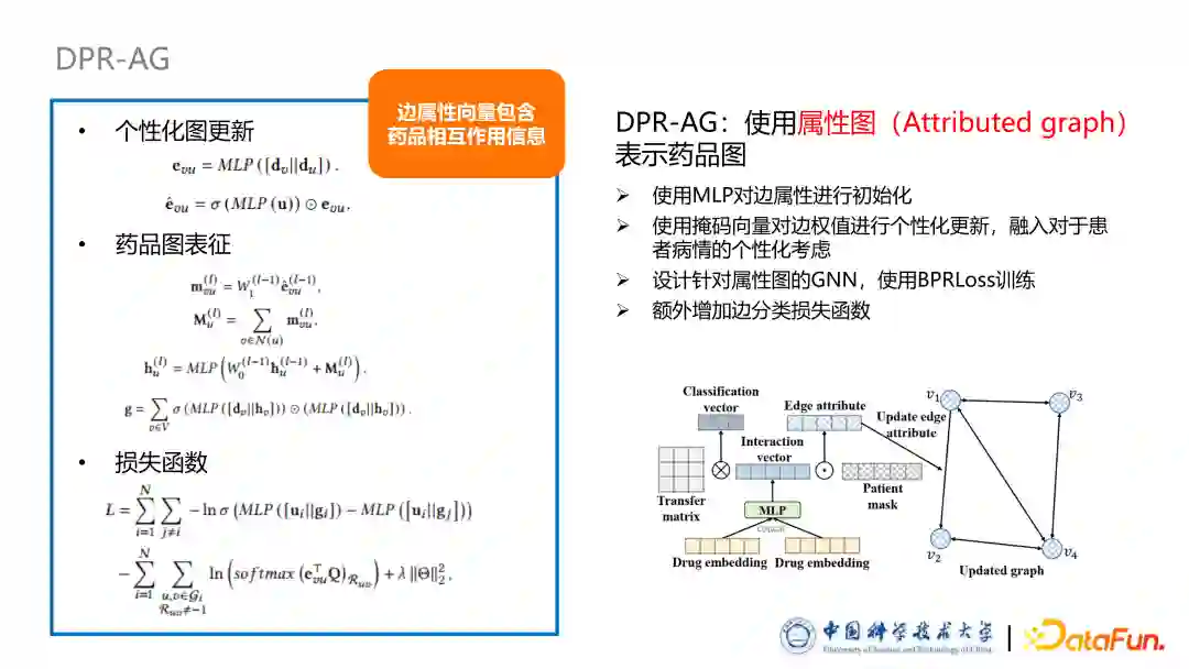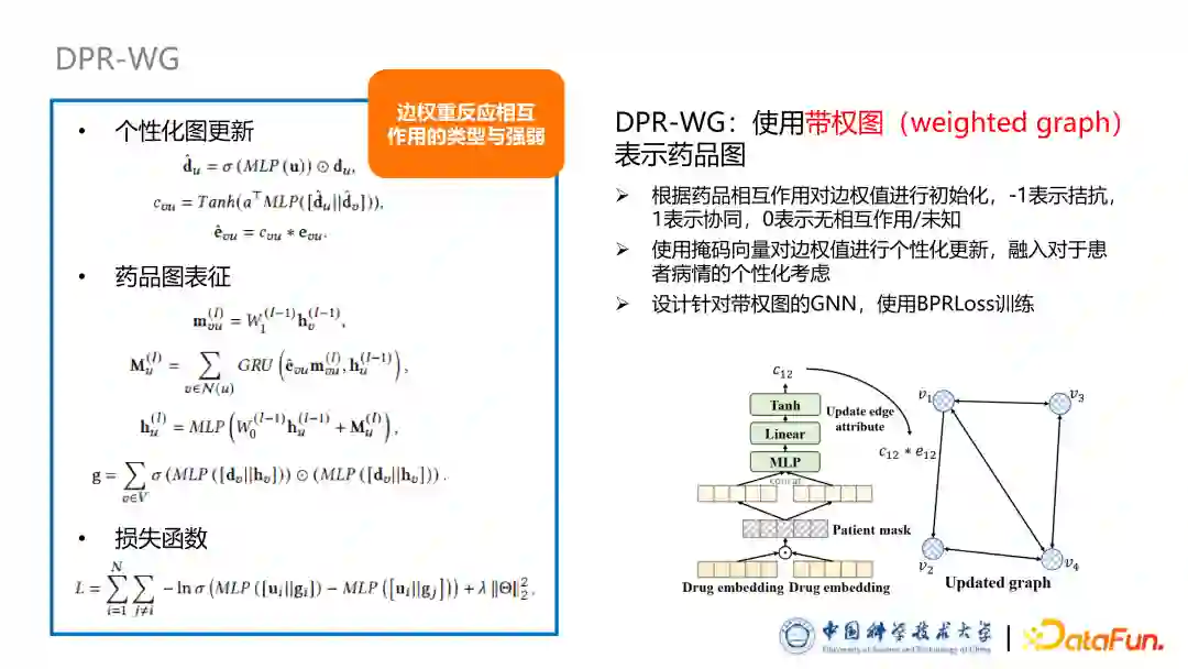 第一种形式是 DPR-WG,使用带权图表示药品图。首先是根据标注好的药品相互作用,对边全值进行初始化,其中使用-1表示拮抗,+1表示协同,0 是表示无相互作用或者未知。随后使用了掩码向量对药品图中的边权值进行个性化的更新。该掩码向量反映了不同药品的相互作用,对于个病人的个性化的影响程度,它的计算方法是使用一个非线性层加 Sigmoid 的函数使得每一个维度取值都是从 0~1 之间,从而实现特征选择的作用,对药品的相互作用进行个性化调整。药品图更新过程是在 DPR-WG 中先算出一个更新因子,更新因子与对应边上的权重相乘或者相加等进行更新。后续实验中发现其实更新方法对结果影响不大,在药品图表征过程中,我们设计了基于带权图的表示药品的方法。总结来说,我们首先设计了一个针对带权图的信息更新过程:聚合邻居信息,在聚合的过程中,根据边的权重,个性化调整它聚合程度。随后我们使用了一个 Self Attention 机制把不同节点之间的权重计算,使用一个聚合 MLP 把图聚合起来得到最终整个药品图的表征。后续把病人表征与药品图表征输入到打分函数里面去,可以得到输出进行推荐。此外,本文使用 BPRLoss 训练模型,引入负采样方法,对应 1 个正样本有 10 个负样本。