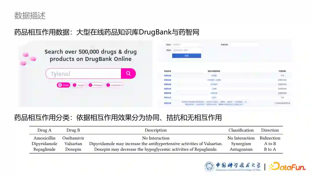 为了研究药品之间的相互作用,我们从 DrugBank 与药制网两个大型在线开源药品知识库里收集了部分药品的属性及相互作用数据。药品相互作用是基于一些模板的自然语言描述,如上图中 description 一栏是在讲某种药品可能可以增加代谢或减弱代谢等,中间话是模板,前后是填充的药品名字。因此只要清楚模型分类,则可以把数据库里所有的药品相互作用进行标记。因此,**我们在专业医师的指导下,把药品相互作用考虑了无相互作用、协同作用和拮抗作用三类,把模板进行了标注,得到了药品相互作用的分类。
