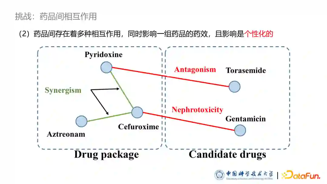 药品推荐系统的第二个挑战是药品之间存在着多种多样的相互作用。有些药品之间存在药效互相促进的协同作用,有些药品间存在药效互相抵消的拮抗作用,甚至有些药品的合用会导致毒性或者其他副作用。图中病人是患有某种肾脏疾病,左边部分是医生为病人所开药品,其中部分药品存在协同作用,可以促进药效。右边部分是统计分析出来的对症高频药品。可以看到这些药品可能是由于一些拮抗作用而没有被选取,下面的药品可能是跟已有的某种药品产生了毒性,因此也没有被此患者使用。此外,药品的相互作用影响是个性化的。我们在数据统计中发现存在大量有拮抗作用、甚至是有毒性作用的药品同时使用。根据分析,其实医生是会根据病人的病情考虑相互作用影响而开出药物。比如一些肾脏健康的病人,他往往可以承受一定的药品肾脏毒性的,因此我们需要对药品之间的相互作用进行个性化的建模和分析。