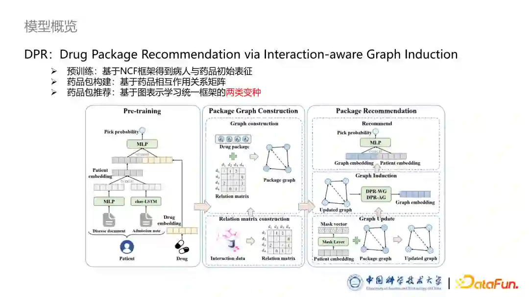 **本文提出的论文题目是 DPR:Drug Package Recommendation via Interaction-aware Graph Induction。模型包括三个部分:**预训练部分,我们基于 NCF 框架得到病人与药品初始表征。药品包构建部分,我们提出了一种基于药品相互作用关系类型,将药品包构建成药品图的方法。最后一个部分是基于图的药品包的推荐框架,其中设计了两个不同的变种,从两种不同的角度去理解如何建模药品之间的相互作用。