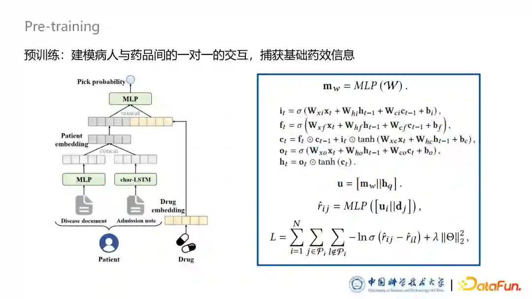 首先预训练部分是按照传统的一对一推荐方式进行的。给定一个病例,医生为给病人使用过的药品是正例,未使用过的药品是负例。通过 BPRLoss 进行预训练,使用过的药品得分比没使用过的高。预训练部分主要是要捕捉基本的药效信息,为后面捕捉更复杂的交互作用提供基础。对于 One-hot 部分,我们使用 MLP 提取特征;对于文本部分,我们使用LSTM提取文本特征。