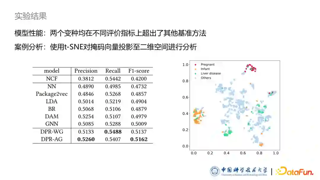 从实验结果来看,我们的两个模型均在不同的评价指标上超出了其他判别式模型。同时我们也进行了案例分析:采用 t-SNE 方法,把之前提到的掩码向量投影到一个二维的空间上。图中所示,比如孕妇、婴儿以及肝脏病人等,他们使用的药物有非常明显的聚集成簇的趋势,证明了我们方法的有效性。03