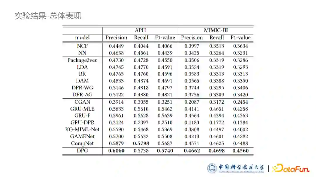 总结与展望总结来说,我们的研究主要是相互作用感知的个性化药品包推荐,包括判别式的药品包推荐以及生成式的药品包推荐。两者共同点是都使用了图表示学习技术来建模药品间的相互作用、都使用了掩码向量考虑病人病情对于相互作用的个性化的感知。两项工作最大的区别是问题定义差别,对于判别模型我们要的是一个打分函数,那么对于生成模型我们要的是一个生成器,通过实验证明,生成式模型其实是对于问题更好的一个定义。