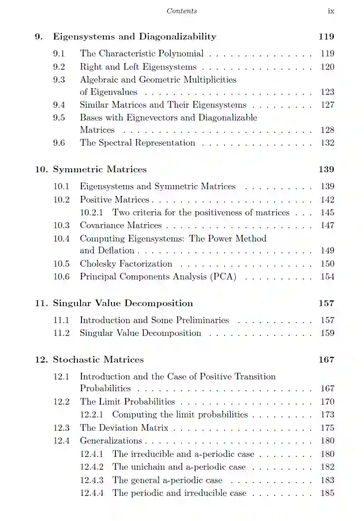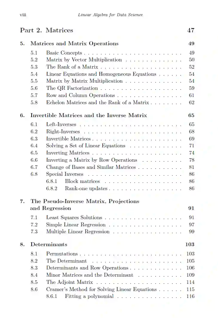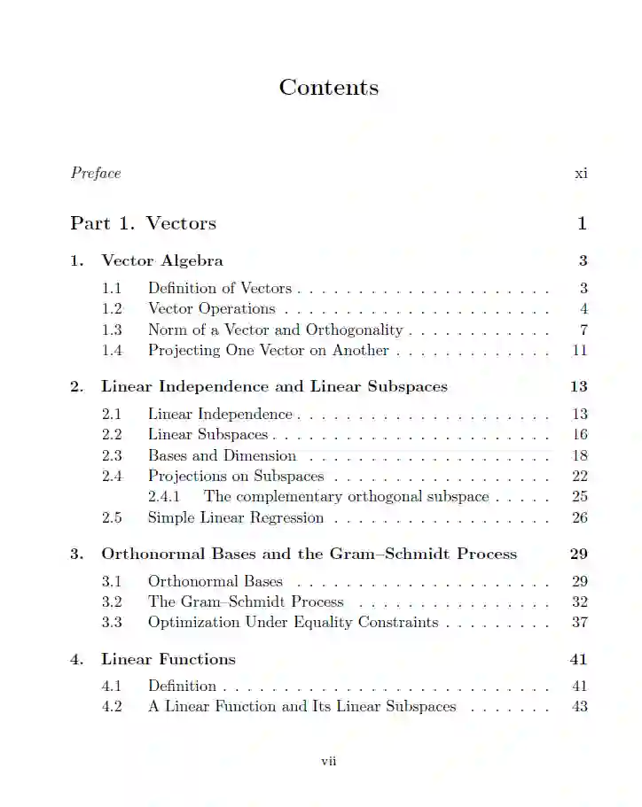 这本书是为数据科学、统计学、计算机科学、经济学和工程学的本科生介绍线性代数的入门书籍。该书以严格(基于证明)的方式呈现所有基本概念,描述结果背后的直觉,同时在其中讨论了一些数据科学的应用。本书分为两部分,一部分是关于向量,另一部分是关于矩阵。前者包括四章:向量代数、线性独立性和线性子空间、正交基和Gram-Schmidt过程、线性函数。后者包含八章:矩阵和矩阵运算、可逆矩阵和矩阵逆、投影和回归、行列式、特征系统和可对角化、对称矩阵、奇异值分解和随机矩阵。书的最后是对整本书十二章中出现的练习题的解答。线性代数就是线性代数,那么为什么标题中会提到数据科学呢?答案是,这本教材的内容是我认为数据科学学生需要知道的。我尝试不在这里加入我认为他们可以不需要知道的内容。此外,当向学生介绍向量和矩阵的符号时,我避免使用像力这样的物理解释。对于数据科学学生来说,当他们想象一个向量时,最好在脑海中有一个带有数字的数组。矩阵也是如此。话虽如此,通过浏览目录,可以看到这本教材涵盖了许多教科书中出现的内容:向量和矩阵、线性子空间、Gram-Schmidt过程、投影和最小二乘法、线性函数、线性方程组、QR分解、逆和伪逆、行列式、特征系统、对称矩阵、奇异值分解,以及随机矩阵。我想提到的是,这里没有涉及复变量,因为我认为在这个阶段它们并不是必要的,并且可能会导致不必要的分心。好的学生可以在他们学习的后期阶段,根据需要填补更专业话题的空白。