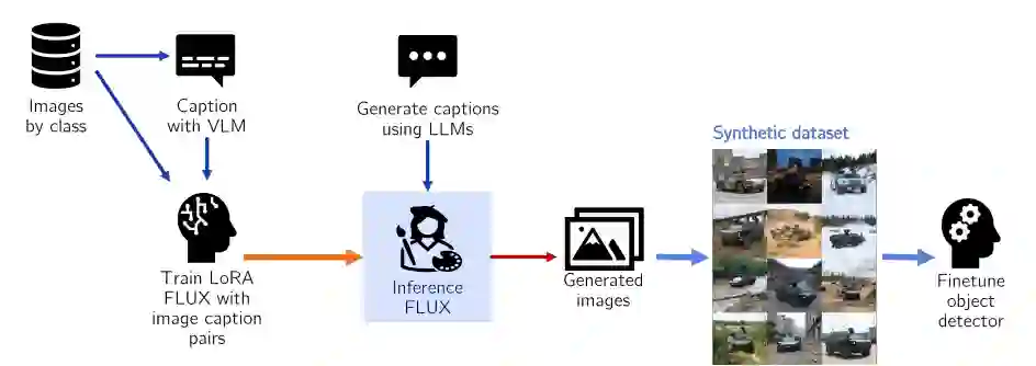 基于扩散的图像合成已成为基于人工智能的目标检测与分类任务中一个有前景的合成训练数据来源。在这项工作中,研究了利用扩散模型生成的图像是否能在低数据条件下改善军用车辆检测。使用LoRA对文生图扩散模型FLUX.1 [dev]进行了微调,每个车辆类别仅使用8张或24张真实图像,覆盖15个车辆类别,从而得到类别专用的扩散模型。这些模型被用来根据自动生成的文本提示生成新样本。相同的真实图像被用于微调RF-DETR检测器,以执行15类目标检测任务。随后,利用扩散模型生成的合成数据集来进一步提升检测器性能。重要的是,这不需要额外的真实数据,因为生成模型利用了同样有限训练样本。FLUX生成的图像提升了检测性能,尤其是在低数据条件下(使用8个真实样本时,mAP50最高提升+8.0%)。为了解决基于文本提示的扩散模型在几何控制上的局限性,额外使用了结合Canny边缘图条件的ControlNet来生成具有结构引导的合成数据,从而得到一个能够明确控制视角和姿态的FLUX-ControlNet(FLUX-CN)数据集。当数据稀缺时,结构引导能进一步提升性能(使用8个真实样本时,mAP50提升+4.1%),但当有更多真实数据可用时,则未观察到额外收益。这项研究表明,针对特定目标的扩散模型可有效改善低数据领域的军事目标检测,并且当真实数据极为有限时,结构引导最为有益。这些结果凸显了生成图像数据可作为训练军事人工智能系统时传统仿真流程的一种替代方案。