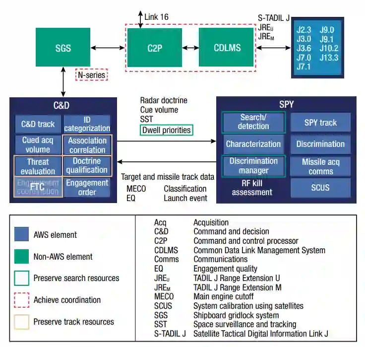 FTC算法在美国海军IAMD平台(主要是宙斯盾巡洋舰和驱逐舰)之间提供分布式、可控的BMD轨道协调。图10描述了一个使用FTC的名义上的部队协调结果。通过避免对链路信息和雷达的修改,FTC保持了一个定义明确的范围,是可以负担得起的,并且可以扩展的。在每个启用的平台上,FTC从通过BMD通信链路传达的Link 16信息中输入空间轨迹图;在宙斯盾武器系统内的指挥和决策元素中进行处理;然后向操作者输出建议。信息交换要求限于现有的MIL-STD-6016信息和交换,由宙斯盾BMD 5.1计划认可,以及操作员和武器系统之间的配置和监督控制信息。图11描述了宙斯盾武器系统中修改后的功能。