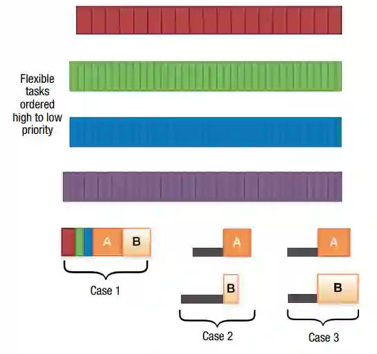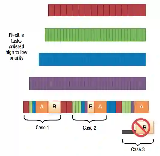 每个固定任务队列中最早的固定任务请求填充到NFT候选池中。选择算法首先在候选者的松弛度允许的范围内,尽可能晚(向右)移动每个候选者(图4)。对于情况1(最高优先级的任务有最早的最后期限),选择算法选择最高优先级的固定任务作为NFT。该算法试图更早地移动NFT,使其与先前安排的固定任务相邻,中间没有间隙。如果NFT不能更早转移,那么它将被尽可能地推迟,下一个DRSI被定义为当前时间和所选NFT结束之间的间隔。图5描述了任务A创造了一个DRSI,灵活的任务被安排在任务A之前,接着是任务B,它被安排在任务A之后,没有间隙。