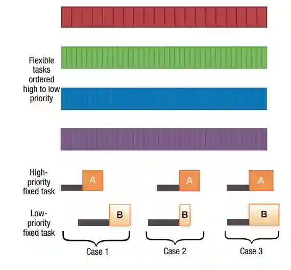 最后,如果有一个优先级较高的固定任务必须被调度,而优先级较低的固定任务要么太长,要么没有足够的松弛时间被容纳,那么该算法就不会调度一个优先级较低的固定任务。这就是案例3,如图7所示。