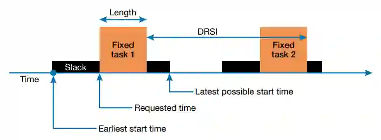 IAMD调度算法利用固定任务的属性来组成一个动态RSI(DRSI)。图2描述了固定任务的属性。固定任务必须在某个时间段内执行。要求的时间是最初要求开始执行的时间。长度是任务将消耗的时间段(占用)(即从任务开始到另一个任务或事件可能被安排的下一个时间之间的时间段)。闲置时间是指该任务在请求时间前后可接受的调度窗口。最早的可能开始时间是请求的时间减去领先的松弛时间。最晚的可能开始时间是所请求的时间加上尾部的时间差。前期和后期的松弛可以是相同的时间,但不要求是相同的时间。DRSI是一个固定任务结束与下一个固定任务结束之间的间隔。该算法将试图把灵活的任务事件放在DRSI中。