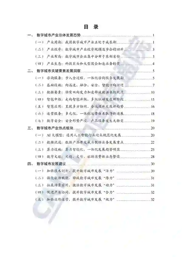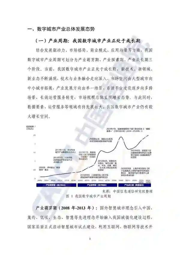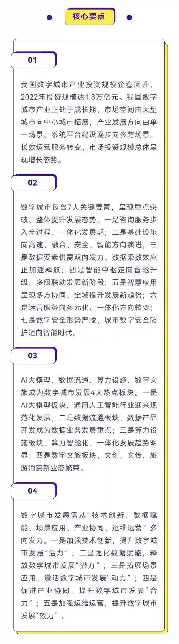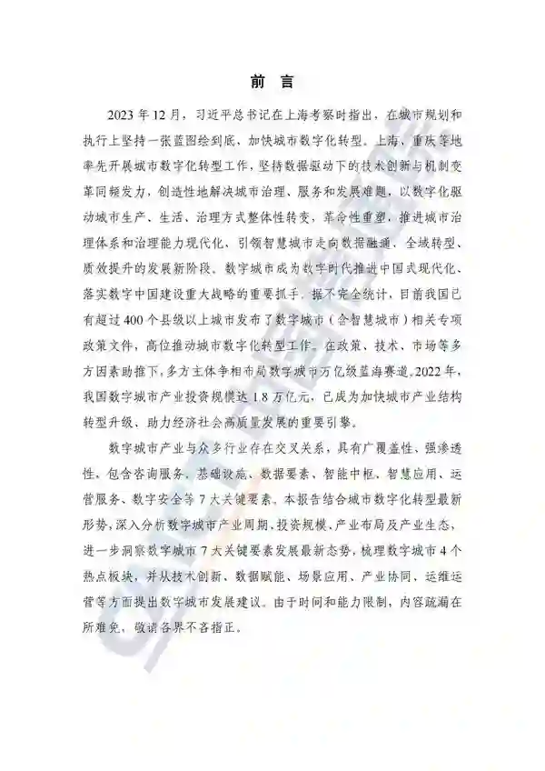 来源:中国信息通信研究院 2023年12月,习近平总书记在上海考察时指出,在城市规划和执行上坚持一张蓝图绘到底,加快城市数字化转型。上海、重庆等地率先开展城市数字化转型工作,坚持数据驱动下的技术创新与机制变革同频发力,创造性地解决城市治理、服务和发展难题,以数字化驱动城市生产、生活、治理方式整体性转变,革命性重塑,推进城市治理体系和治理能力现代化,引领智慧城市走向数据融通、全域转型、质效提升的发展新阶段。数字城市成为数字时代推进中国式现代化、落实数字中国建设重大战略的重要抓手。在政策、技术、市场等多方因素助推下,多方主体争相布局数字城市万亿级蓝海赛道,数字城市产业成为加快城市产业结构转型升级、助力经济社会高质量发展的重要引擎。 基于此,中国信息通信研究院成立项目组,开展数字城市产业研究工作,编制了《数字城市产业研究报告》。近日,该报告正式发布。 报告结合城市数字化转型最新形势,深入分析数字城市产业周期、投资规模、产业布局及产业生态,进一步洞察数字城市咨询服务、基础设施、数据要素、智能中枢、智慧应用、运营服务、数字安全等7大关键要素发展最新态势,梳理AI大模型、数据流通、算力设施、数字文旅4大热点板块,并从技术创新、数据赋能、场景应用、产业协同、运维运营等方面提出数字城市发展建议。