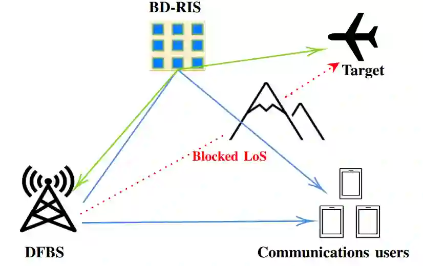 图 1. 启用 BD-RIS 的 ISAC 系统示意图。当 LoS 受阻时,通过 BD-RIS 的 NLoS 路径可在目标/用户与 DFBS 之间建立链接。