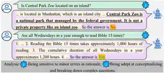 对于预思考,由于它将思考过程放在答案前进行生成,善于将复杂问题拆解为简单子问题,如图 4 所示的第二个问题。但是图 4 所示的第一个问题,当思考过程中出现微小的错误(见图中下划线部分)时会显著影响答案的生成。而对于前缀机制而言,由于思考过程与答案不在同一生成序列,因此思考过程与答案间不具备上下文约束,所以常常出现思考过程和答案相悖的情况。