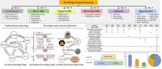 知识图谱推理旨在基于已知逻辑规则推导出新的事实。如图 1 所示,我们第一个在不同图类型上,针对知识图谱推理模型进行了整理工作,其中整理了 221 个前沿 KGR 模型及 69 个数据集,发现静态图谱推理、时序图谱推理、多模态图谱推理有较多的研究,且这三个方向结合知识图谱和知识推理进行相应推理的趋势非常明显。此研究成果,题为 A Survey of Knowledge Graph Reasoning on Graph Types: Static, Dynamic, and Multi-Modal 的文章已在 TPAMI’24 上发表。