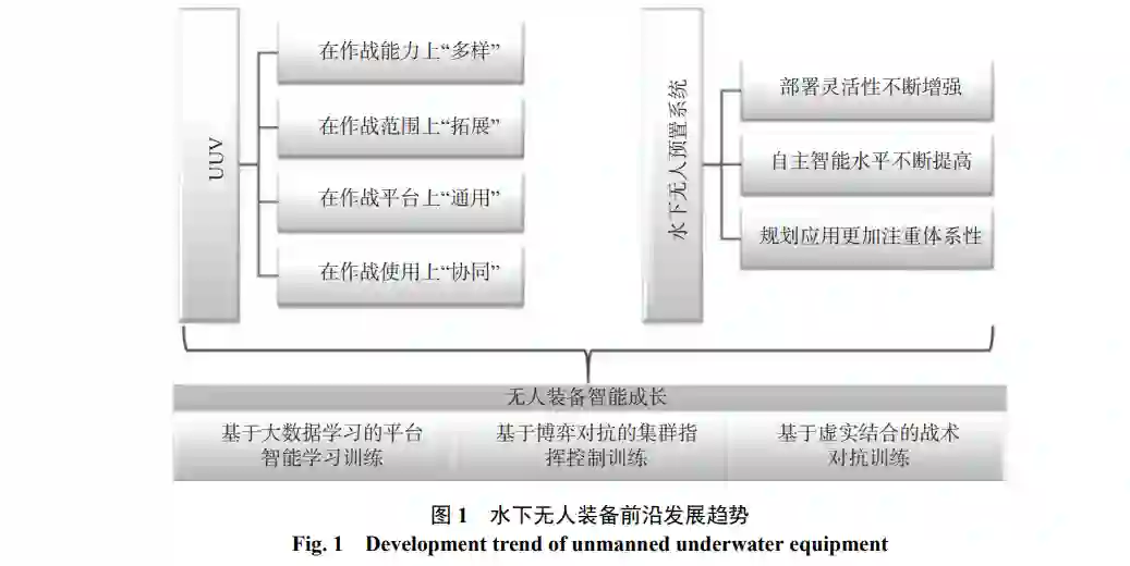 在军事领域里, 典型的水下无人装备主要有无人水下航行器(unmanned undersea vehicle, UUV)和水下无人预置系统, 其中水下无人预置系统包括水下预置武器和水下预置基础设施。UUV具有效费比高、隐身性能好、作战用途广和智能程度高等优势, 是未来智能化战争中重要的新质作战装备[5-9]。水下无人预置系统搭载载荷丰富多样, 具有潜伏时间长、广域分布、隐蔽性好及响应快速等优点, 已成为未来水下攻防对抗体系的重要组成部分[9]。在当前深远海技术和军事智能技术的发展推动下, 水下无人装备已具备执行多类型复杂任务的能力[10], 将对未来战争产生非对称、颠覆性作用, 在智能化海战中的地位日益突出。目前世界各海洋强国都加速推进水下无人装备的技术研发与应用, 抢占未来海上竞争新的制高点。