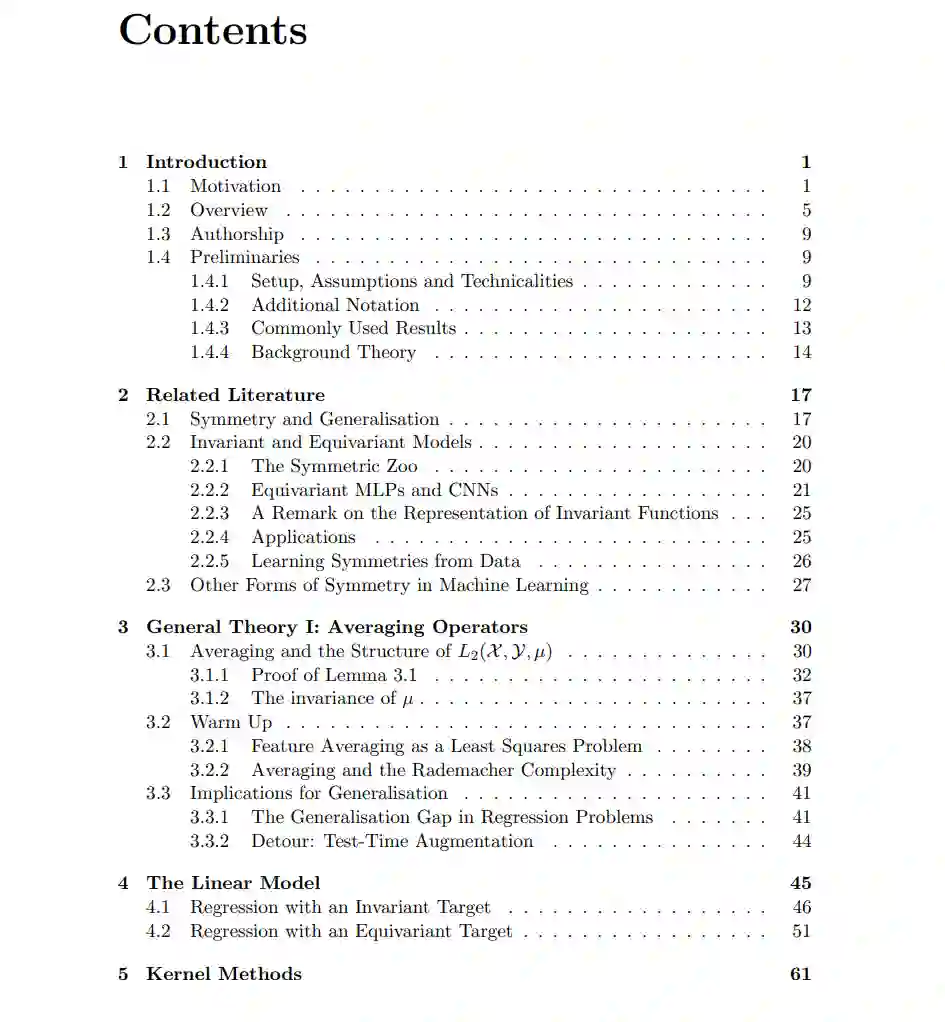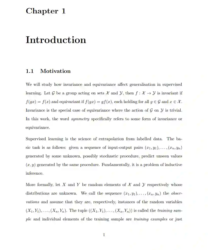 这项工作旨在理解不变性和等变性对监督学习中泛化的影响。我们利用平均算子的视角来展示,对于任何非等变的预测器,存在一个具有严格更低测试风险的等变预测器,适用于所有正确指定等变性的回归问题。这构成了一个严格的证明:对称性(以不变性或等变性的形式)是一种有用的归纳偏差。 我们将这些想法应用于随机设计最小二乘法和核岭回归中的等变性和不变性。这使我们能够在更具体的设置中指定预期测试风险的减少,并根据群体、模型和数据的属性来表达它。 在此过程中,我们给出了例子和额外的结果,以展示平均算子方法在分析等变预测器时的实用性。此外,我们采用了另一种视角,将使用不变模型进行学习的常见直觉形式化为关于轨道代表的问题。这种形式主义自然地扩展到对等变模型的类似直觉。我们通过连接这两种视角并提出未来工作的一些想法来结束。