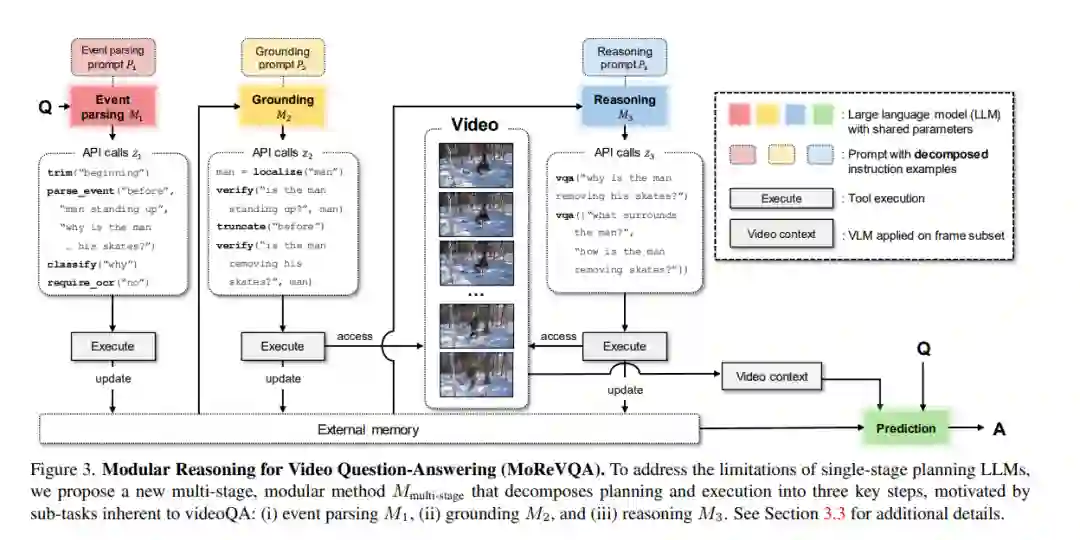 本文通过一个分解的多阶段、模块化推理框架来解决视频问答(videoQA)任务。以往的模块化方法已经在视觉内容未涉及的单一规划阶段显示出潜力。然而,通过一个简单有效的基线,我们发现这样的系统在实践中对于具有挑战性的视频问答设置可能导致脆弱的行为。因此,与传统的单阶段规划方法不同,我们提出一个包括事件解析器、基础阶段和最终推理阶段以及外部存储的多阶段系统。所有阶段都无需训练,并通过大模型的少数次提示进行,每个阶段都产生可解释的中间输出。通过分解基础规划和任务复杂性,我们的方法MoReVQA在标准视频问答基准(NExT-QA、iVQA、EgoSchema、ActivityNet-QA)上超越了以往的工作,取得了最新的成果,并扩展到相关任务(基于视频的问答、段落标题生成)。