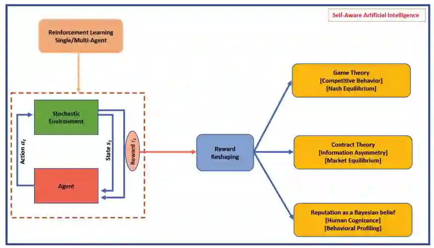 无人驾驶飞行器(UAV)或多接入边缘计算服务器(MEC)等相互依赖的计算系统的快速发展带来了海量数据和严格的服务质量(QoS)要求。当这些系统以自主方式行动时,它们会表现出竞争行为,因为每个系统都想自私地优化自己的主观标准。这就引入了非合作环境中交互决策的概念,即每个系统的反馈都取决于其他系统可能相互冲突的行动。因此,本文利用博弈论来有效捕捉非合作环境中相互依赖的计算系统之间的战略互动,并证明存在解决方案,即稳定的均衡点。均衡点被认为是稳定的解决方案,因为每个系统都没有单方面改变自身行动的战略动机。为了以分布式方式确定这些均衡点,我们采用了强化学习(RL)技术,该技术可使相互依存的自主计算系统在随机环境中利用自身行动和经验的反馈,通过试错进行智能学习。此外,传统的强化学习方法还加入了奖励重塑技术,通过契约理论考虑自主互联计算系统之间类似劳动经济学的安排,并通过贝叶斯信念模型考虑它们的行为特征。同时利用博弈论和强化学习与奖励重塑技术,是向自感知人工智能(SAAI)迈出的一步。本文证明,它极有可能成为构建基于人工智能的自主决策相互依赖计算系统的主要组成部分,并能有效地应用于各种应用领域。