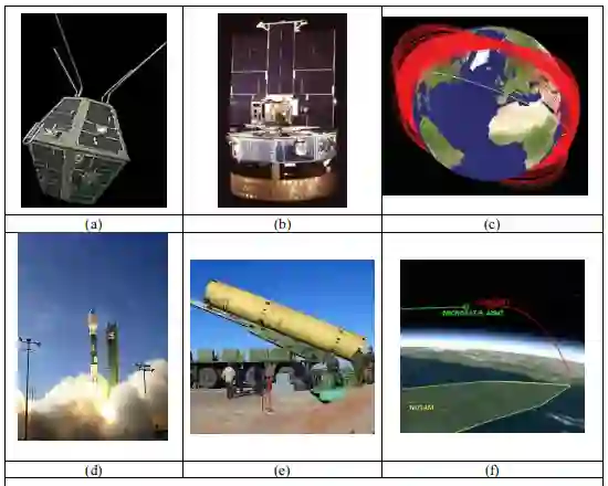 其中,反卫星(ASAT)导弹试验将是产生碎片的主要原因,我们在图1(a-f)中汇编了一些与反卫星有关的历史事件。世界上第一次反卫星导弹试验是在1970年2月由苏联对一个特殊的目标航天器DS-P1-M进行的。美国于1985年9月13日完成了针对伽马射线光谱学卫星Solwind P78-1的首次成功的反卫星导弹试验。这次试验产生了285块编入目录的轨道碎片。2008年2月21日,美国海军摧毁了发生故障的美国间谍卫星USA-193[10],2015年11月18日,俄罗斯的直接升空反卫星导弹的飞行试验[11],以及2019年3月27日,印度的试验。