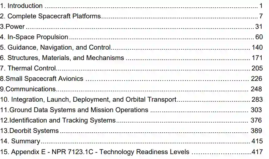 美国国家航空航天局的《小型航天器技术现状》报告每年更新一次,以收集美国国家航空航天局和其他来源公开的小型航天器系统的新信息。每一章都介绍了当前最先进的小型卫星技术的发展状况,以及设计方面的注意事项,供读者在为其任务确定组件时参考。每章的组织方法包括技术介绍、该技术可采购系统的当前开发状况以及所调查技术的汇总表。这样,每一章都是一份有关主题航天器子系统的独立报告,并酌情提供有关新技术、成熟技术和参考任务的最新信息。