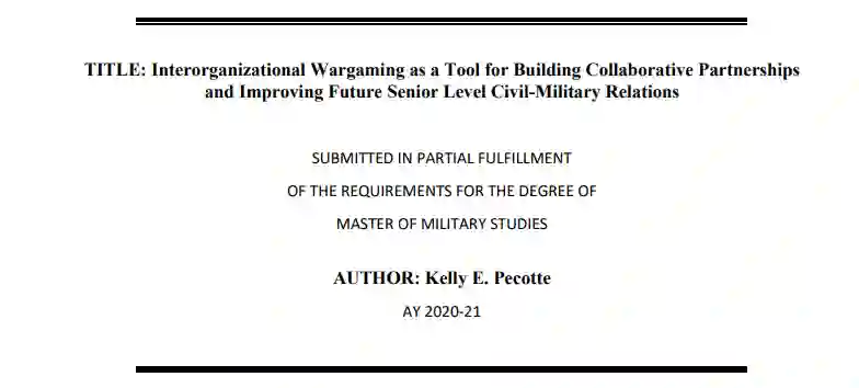 这篇研究论文探讨了美国政府(USG)高级文职领导人和高级军事领导人之间历史上经常发生争执的关系,并提出了在未来高级领导人之间建立协作伙伴关系的方法。本文特别关注增加未来军队和美国政府领导人之间的合作。本文建议文职和军事专业人员将组织间的兵棋推演作为一种途径,在战地级军官和同等级别的联邦政府文职人员之间建立合作关系。美国政府和私营企业在冷战期间利用兵棋推演成功地进行了批判性思维和决策方法。今天在设计组织间兵棋推演时,文职和军事领导人可以从探索这个时代的洞察力中受益。