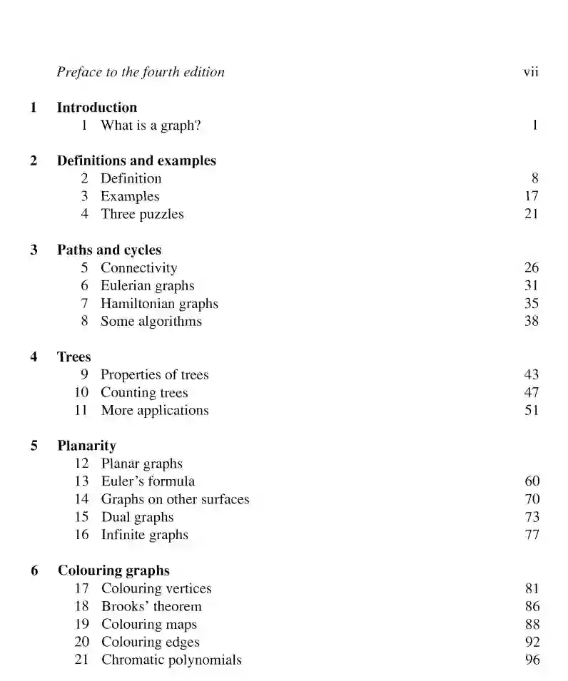 近年来,图论已经确立为许多领域中的重要数学工具,从运筹学和化学到遗传学和语言学,从电气工程和地理学到社会学和建筑学。与此同时,它也已经成为一个有价值的独立数学学科。鉴于此,我们需要一本关于该主题的低价的入门教材,既适合学习图论的数学家,也适合希望尽快学习该主题的非专家。我希望这本书能够在某种程度上满足这一需求。读这本书的唯一先决条件是对基础集合论和矩阵论有基本的了解,尽管对抽象代数的进一步了解对于更困难的练习是必要的。这本书的内容可以方便地分为四部分。其中的第一部分(第1-4章)提供了一个基础课程,包含图的定义和示例、连通性、Euler和Hamilton路径与循环以及树。接下来是两章(第5章和第6章)关于平面性和着色,特别是关于四色定理。第三部分(第7章和第8章)涉及有向图的理论和横截理论,应用于关键路径分析、马尔可夫链和网络流。本书以关于拟阵的一章(第9章)结束,它整合了前面章节的内容并介绍了一些最近的发展。